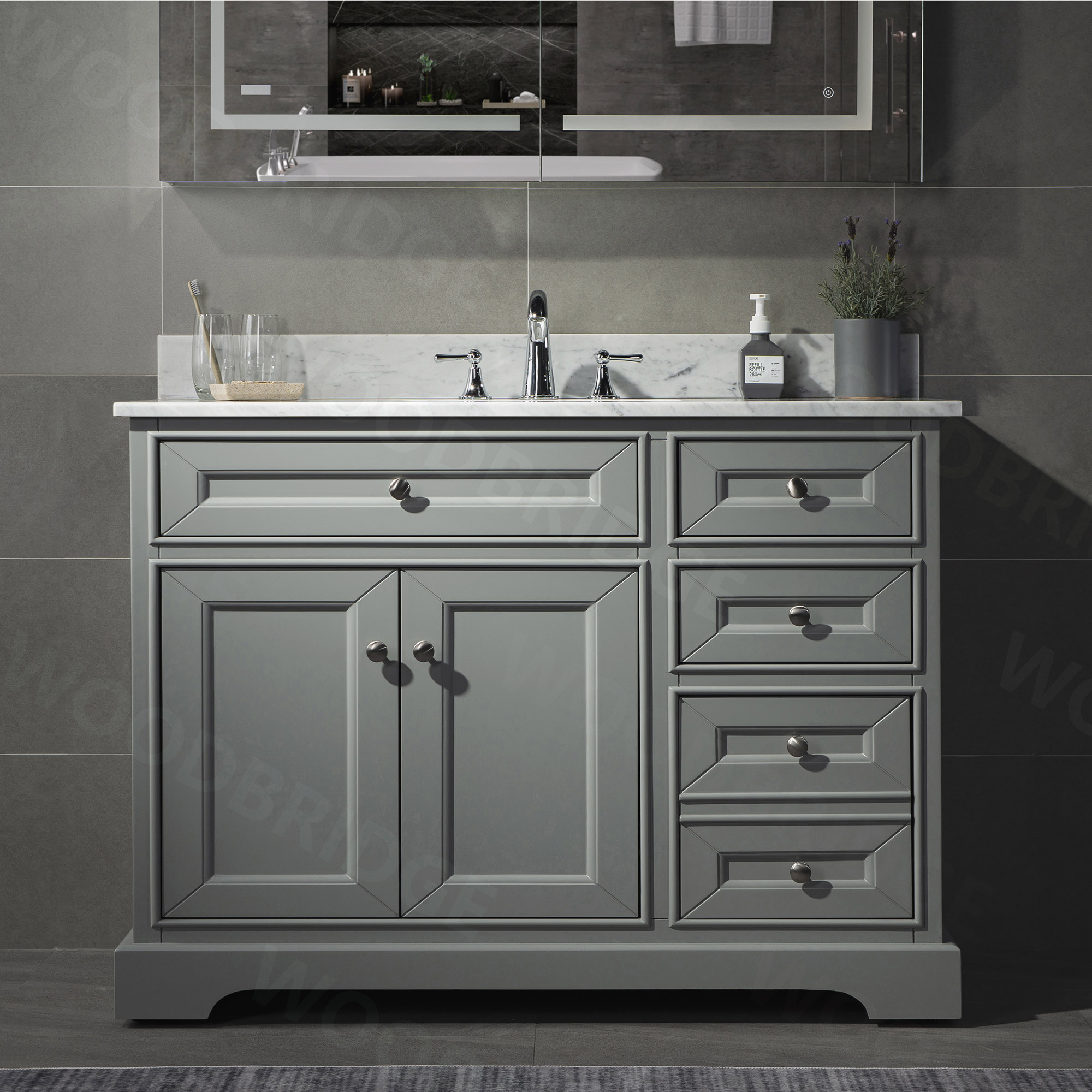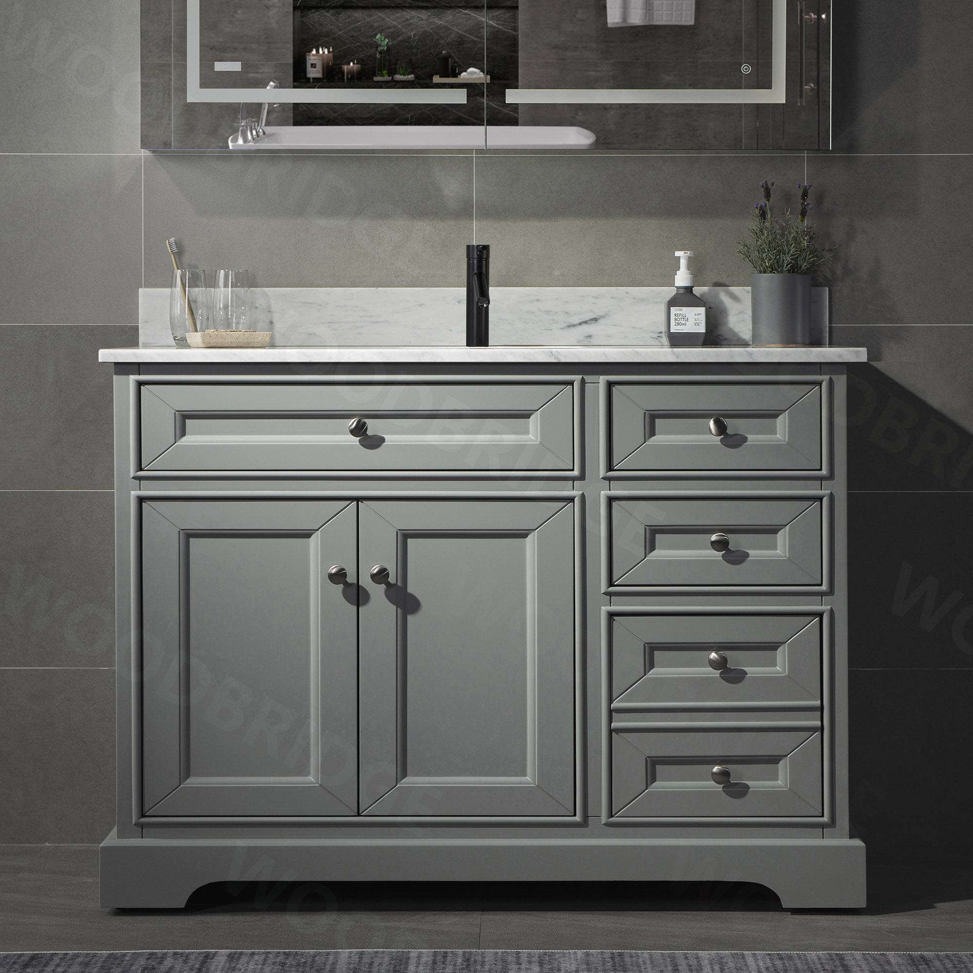 ✅ [NOTE]: Three drawers are on the right; Variations in color hues and vein patterns are common in all stone effect vanity tops. Faucet, Plumbing, silicone caulking and matching mirror are NOT included and are sold separately.