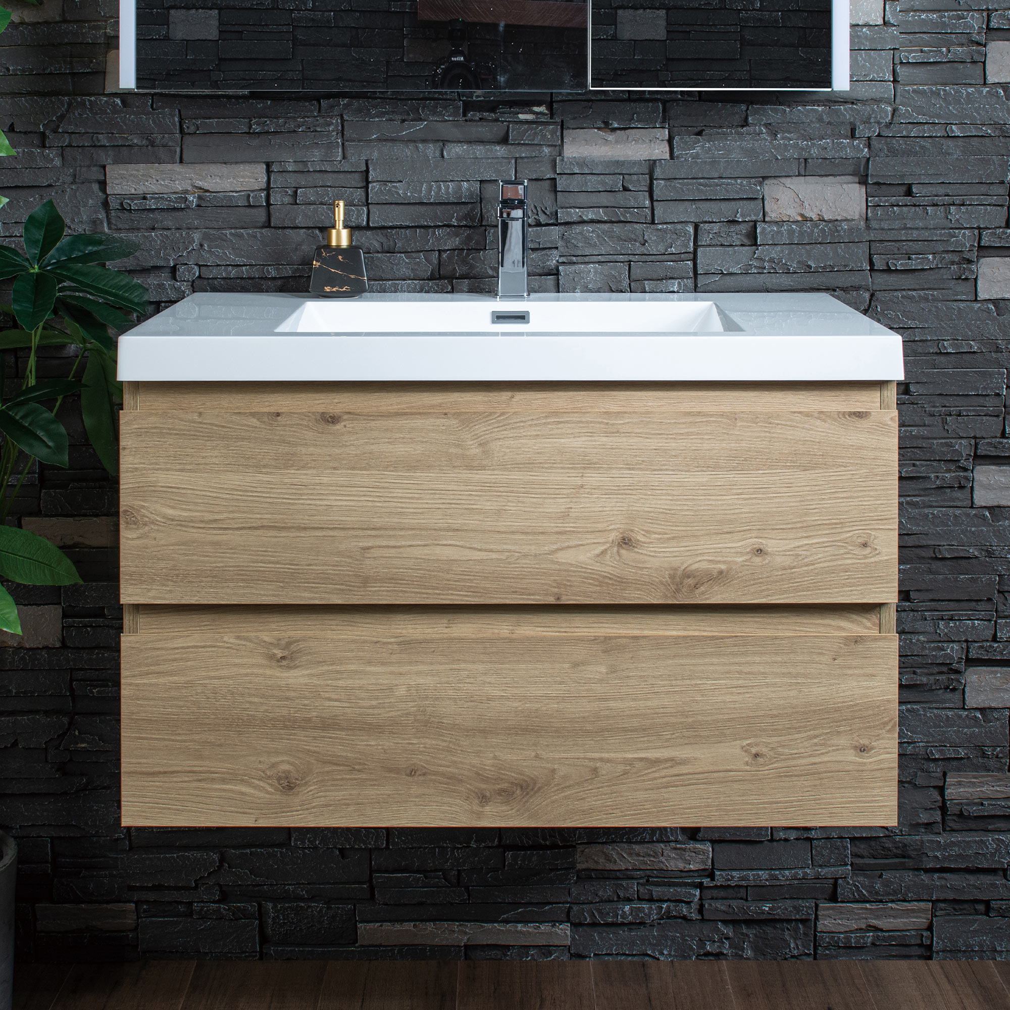 WOODBRIDGE 35-3/8 in. W x 19 in. D Wall Mounted Floating Vanity in Natural Oak with Resin Composite Vanity Top in Glossy White