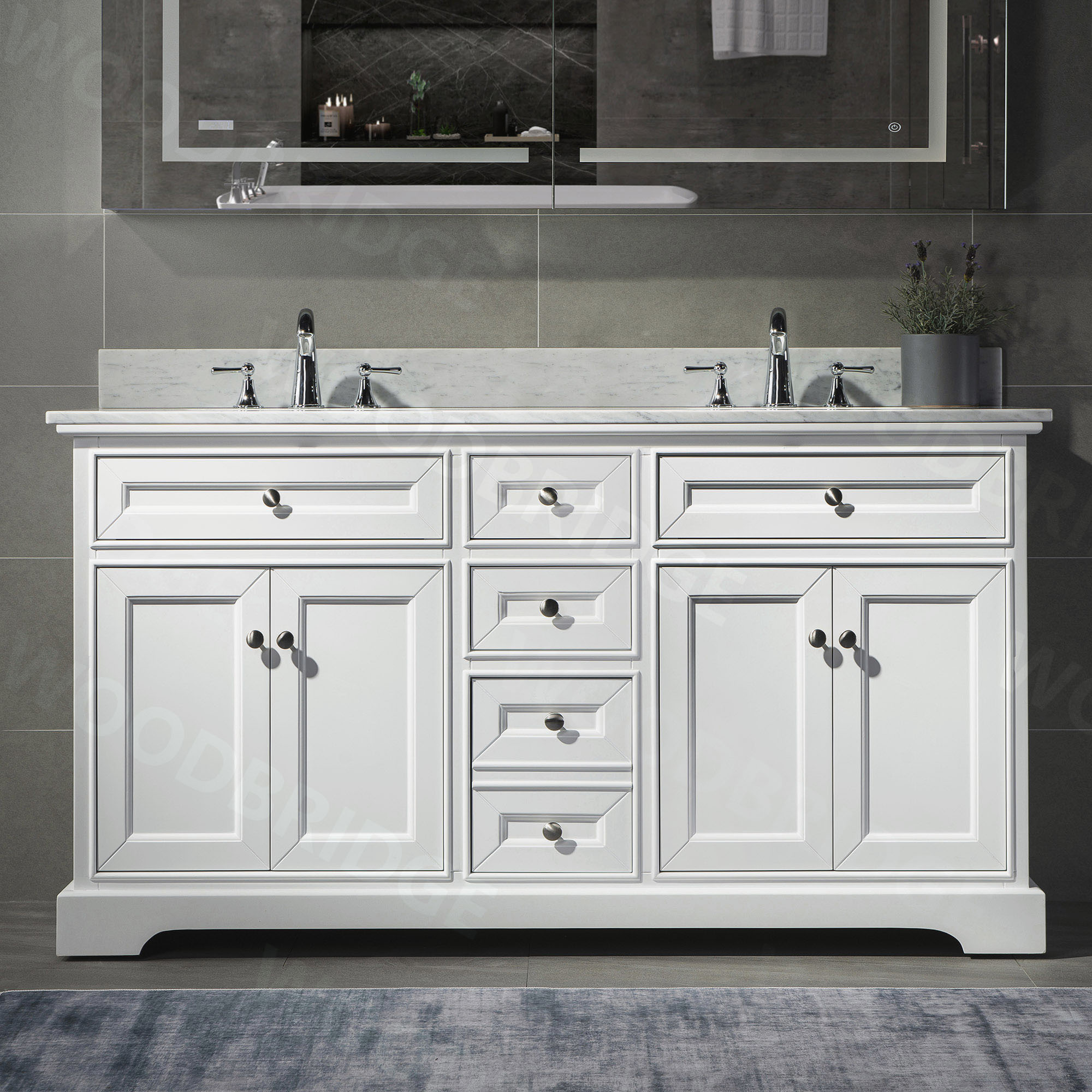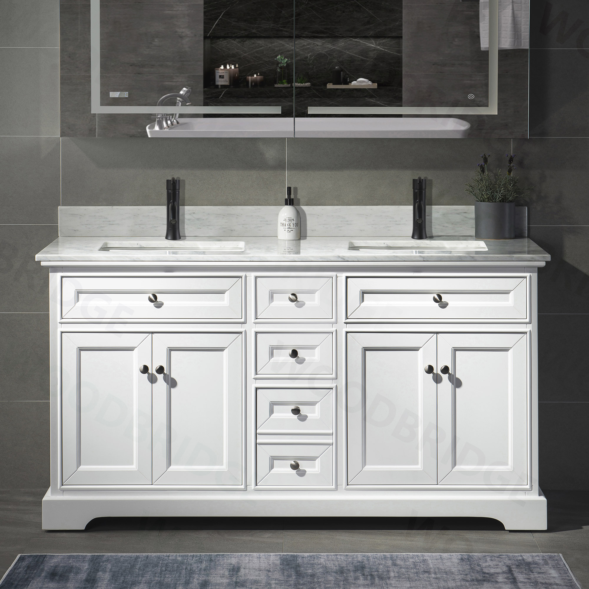 ✅ [DIMENSIONS]: Vanity dimensions: 60" L x 21-5/8" W x 33" H; Carrara white marble vanity top dimensions: 61" L x 22" W; Assembled dimensions with top and back splash: 61" W x 22" D x 38" H